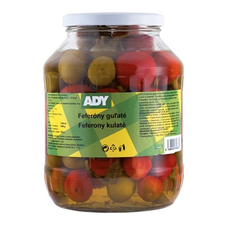- feferony kulaté, pitná voda, ocet kvasný lihový, jedlá sůl jodovaná (jedlá sůl, jodičnan draselný), cukr, stabilizátor: chlorid vápenatý, sladidlo: sacharin sodný