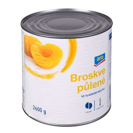 - Broskve půlené ve sladkém nálevu. Pasterováno. Zpracované ovoce ve sladkém nálevu.