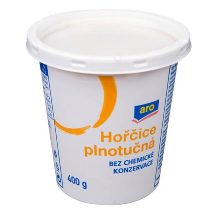 - Pitná voda, HOŘČIČNÉ semeno, ocet kvasný lihový, cukr, jedlá sůl, kurkuma, výtažek koření. Obsah soli max. 3 %.