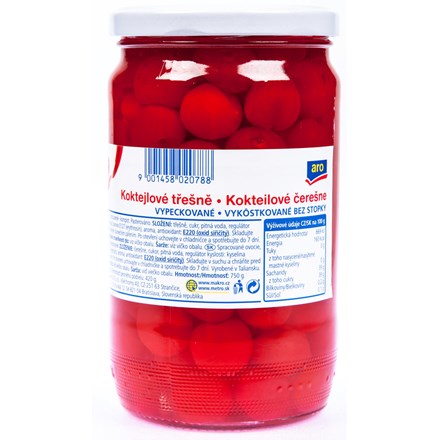 - třešně, cukr, pitná voda, regulátor kyselosti: kyselina citronová, barvivo E127 ( erythrosin ), aroma, antioxidant: E220 ( oxid siřičitý ).