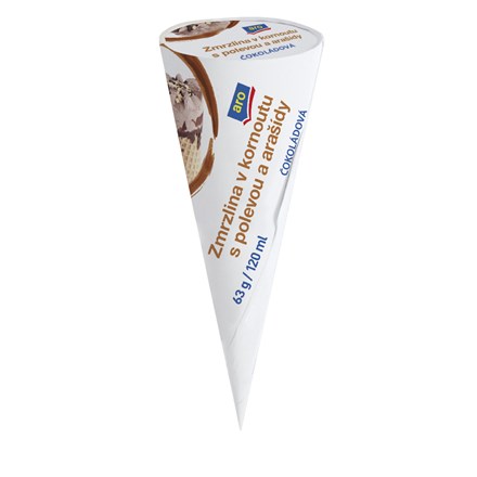 - Mražený krém s rostlinným tukem čokoládový s čokoládovým toppingem a posypem arašídů, v oplatkovém kornoutu s kakaovou polevou.