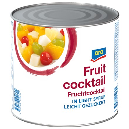 - Směs ovoce v proměnlivém poměru [hruška, broskev, ananas, hroznové víno, třešně (barvivo: erythrosin)], voda, cukr, regulátor kyselosti: kyselina citronová; antioxidant: kyselina askorbová.