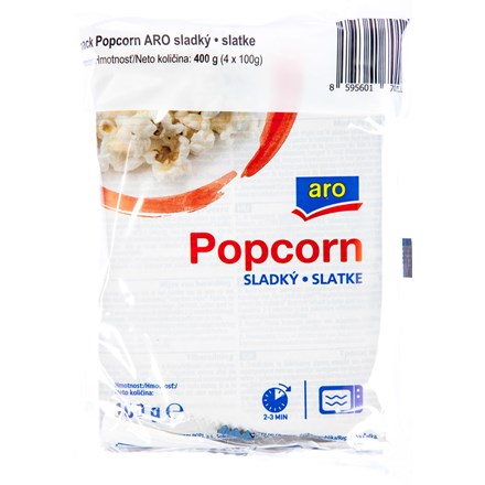 - kukuřičná zrna na popcorn 71 %, cukr 19 %, palmový tuk, aroma, barvivo: karoteny;