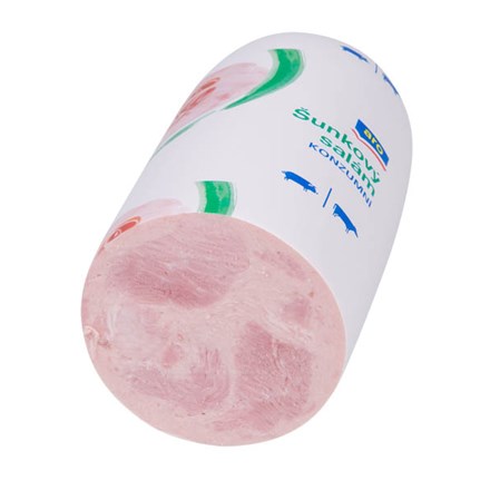 - vepřové maso(52%),pitná voda,bramborový škrob,hovězí maso(3%),jedlá sůl,sušený česnek,cukr,extrakty koření,dextróza, konzervant(E250), stabilizátory(E450,E451),zahušťovadla(E407a,E407,E415),vepřová bílkovina,šunkové aroma,látky zvýrazňující chuť a vůni(E621,E635), antioxidanty(E316,E331),barvivo(E120).