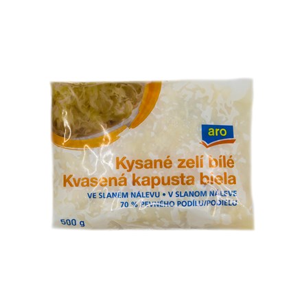 - kysané zelí bílé (zelí hlávkové bílé, jedlá sůl, koření), slaný nálev (pitná voda, jedlá sůl, konzervant: benzoan sodný).
