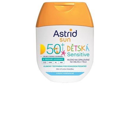- Astrid sun dětské mléko Sensitive OF50+ pro citlivou pokožku nabízí mnohem více než jen základní ochranu proti slunci. Zohledňuje speciální dermatologické potřeby dětí a poskytuje optimální ochranu před 4 hlavními typy slunečního záření (UVA, UVB, VL, IRA), které poškozují pokožku. Zároveň pomáhá minimalizovat riziko alergických reakcí a předcházet dehydrataci pokožky.