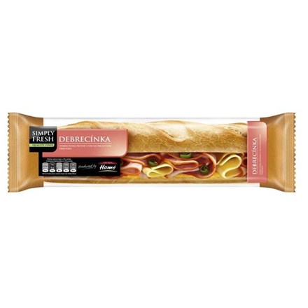 - 51% pečivo - PŠENIČNÁ MOUKA, droždí, sůl, vepřové sádlo, cukr, přípravek zlepšující mouku (PŠENIČNÁ MOUKA, emulgátor E 471, SLADOVÁ MOUKA, zahušťovadlo xanthan, látka zlepšující mouku kyselina L-askorbová, regulátor kyselosti E 341, enzym), voda; 27% debrecínská pečeně - vepřové maso, voda, bramborový škrob, kůže, jedlá sůl, konzervanty dusitan sodný, kyselina octová a mléčná, stabilizátor E 452, regulátory kyselosti E 500 a chlorid draselný, zahušťovadla karagenan, guma guar, xanthan, E 450 a E 451, antioxidant askorbát sodný, barvivo košenila; 14% dresink - řepkový olej, voda, cukr, ocet, rajčatový protlak, VEJCE, HOŘČIČNÉ SEMÍNKO, jedlá sůl, zahušťovadlo modifikovaný škrob, koření, cibulové aroma, stabilizátor guarová guma a xanthan, konzervant sorbát draselný, byliny, přírodní barvivo betakaroten; 5% SÝR Eidam - PASTERIZOVANÉ MLÉKO, mlékárenské kultury, barvivo annato, sůl, konzervant dusičnan draselný, stabilizátor chlorid vápenatý; 2% cibulka jarní