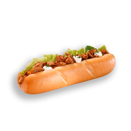 - Pšeničné pečivo min. 45 % (pšeničná mouka, zlepšující přípravek, cukr, sůl, droždí, pražený ječmen, řepkový olej, lepek, voda), kuřecí gyros min. 28 % (kuřecí maso, směs koření), hořčičný dresink [majonéza (řepkový olej, vaječný žloutek, kvasný ocet lihový, zahušťovadlo modifikovaný škrob, hořčice (semeno hořčice, kurkuma, koření), stabilizátory guma guar, karubin a xanthan, regulátor kyselosti kyselina citronová, konzervant sorbát draselný, maltodextrin), hořčice], čínské zelí, kapie