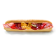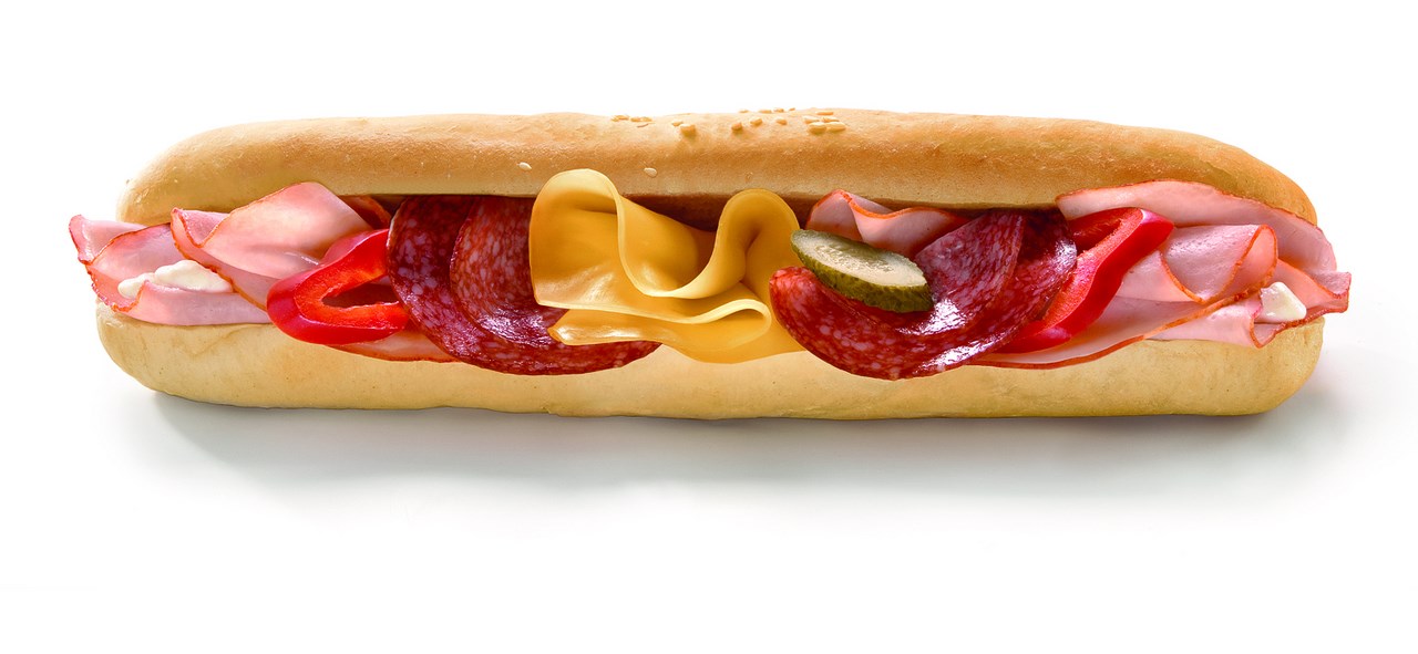 - 50% bageta světlá (pšeničná mouka, voda, emulgátor, rostlinný tuk, aroma, droždí sůl, zlepšující pekařský přípravek - ječný a pšeničný slad, cukr, stabilizátor, sojová mouka, kyselina askorbová, cystein), 18% debrecínská pečeně (80% vepřová pečeně, voda, sůl, konzervant dusitan sodný, cukr, živočišná bílkovina, stabilizátory di a trifosforečnany, antioxidant askorban sodný, zahušťovadla guma euchema,xanthan, modifikovaný škrob, paprika, paprikový extrakt), majonézový dresink (řepkový olej, jogurt, žloutek, hořčice, modifikovaný bramborový škrob, stabilizátory karubin, guma guar, xanthan, konzervant sorban draselný, benzoan sodný), sýr eidam 30% t.v.s. (mléko, mlékařské kultury), 5% herkules (vepřové maso a sádlo, hovězí maso, sůl, konzervant dusitan sodný,vepřové kůže, koření, dextróza, barvivo z červené řepy, antioxidant erythorban sodný, košenila), sterilovaná okurka