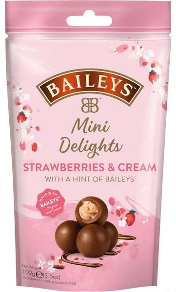 - cukr, kakaové máslo, sušené odstředěné MLÉKO, rostlinné oleje (palmový, řepkový, slunečnicový), kakaová hmota, glukózový sirup, Baileys originální irský krémový likér (6%) (SMETANA, cukr, líh, maltodextrin, MLÉČNÉ bílkoviny, aromata, irská obilná whiskey, barvivo: kaustický sulfitový karamel, emulgátory: mono- a dygliceridy mastných kyselin, regulátor kyselosti: citronany sodné), pitná voda, zvlhčovadlo: sorbitolový sirup, sušené odstředěné MLÉKO, dextróza, mražené sušené jahody, emulgátor: SÓJOVÝ lecitin, konzervant: kyselina sorbová, příchutě, regulátor kyselosti: citronany sodné. Obsah kakaové sušiny v mléčné čokoládě minimálně 37 %. Obsah mléčné sušiny minimálně 14 %. Výrobek není vhodý pro děti. Obsahuje méně než 1% alkoholu.