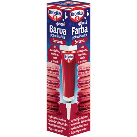 - Odšroubujeme uzávěr, odstřihneme špičku a posupně přidáváme do těsta, krému, marcipánu nebo fondánu. Rady a tipy - Tubu je vhodné před použitím mírně promačkat prsty, aby se barva v tubě lépe promíchala. - Po přidání barvy do marcipánu nebo fondánu důkladně hněteme, abychom zabarvili hmotu rovnoměrně. - Vždy si připravíme potřebné množství barevné hmoty najednou, protože opakovaně získat stejný odstín barvy je velmi náročné. - Zajímavé melírované/mramorované efekty je možné dosáhnout tím, že hmotu hněteme méně, tím vznikne nahodilé melírování/mramorování. Doporučujeme vyzkoušet! - Barvy je možné navzájem míchat. - Diky použitým barvivům je možné Barvy gelové potravinářské Dr.Oetker lépe smýt z rukou i z pracovní plochy. - Hmota se nesmí dostat do tuby s barvou, trvanlivost výrobku by byla porušena. - Na 100g hmoty použijeme max. 2 kávové lžičky barvy. - Při použití černé barvy je možné dávkovat vyšší množství barvy pro dosažení potřebného černého odstínu. - Není vhodné pro děti do 36 měsíců. Hrozí nebezpečí udušení (vdechnutím). s přírodními barvivy; jednoduché dávkování; tepelně stabilní barva; tipy a rady uvnitř