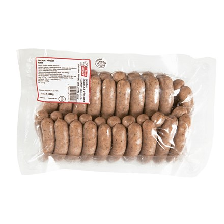 - Složení: vepřové a hovězí maso 87% hm., pitná voda, bramborový škrob, jedlá sůl, koření, látka zvýrazňující chuť a vůni E621, stabilizátor E450, zahušťovadlo E451.Naraženo do skopového střívka. Baleno v ochranné atmosféře (dusík, oxid uhličitý).