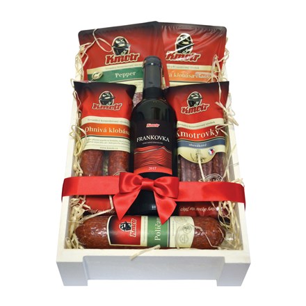 - Netradiční dárkové balení trvanlivých výrobků v elegantní bílé dřevěné bedýnce. Bedýnka obsahuje červené víno 0,375l, krájenou Kmotrovu klobásu classic, jedinečný krájený salám Pepé s floky papričky jalapeňo, tradiční salám Poličan, pikantní Ohnivou klobásu a uherákové KMOTROVKY. Dárkové balení je ozdobeno červenou stuhou. Ideální dárek, který potěší nejen Vaše blízké!
