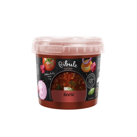 - Cibule Bistro hovězí vývar 22 % (pitná voda, hovězí maso a kosti, cibule, mrkev, celer, směs koření, jedlá sůl, slunečnicový olej), pitná voda, hovězí maso 9 %, cibule 7 %, zelenina v různém poměru 6 % (mrkev, celer, pastinák), brambory, sterilovaná řepa 5 %, vepřové sádlo, uzená vepřová krkovice 2 % (vepřová krkovice 75 %, pitná voda, jedlá sůl, jodičnan draselný, konzervant: E250; stabilizátor: E451; škrob, zahušťovadla: E407a, E415; vepřová bílkovina, aroma, cukr, antioxidant: E316), zahuštěný rajčatový protlak 1,4 %, pšeničná mouka, kapusta, bílí zelí hlávkové, jedlá sůl, kopr 0,3 %, citronová šťáva z koncentrátu, paprika mletá, nové koření, ocet kvasný lihový, černý pepř 0,03 %, bobkový list 0,03 %, nálev z řepy (pitná voda, ocet kvasný lihový, jedlá sůl, sladidlo: sacharin; anýzové a fenyklové aroma).