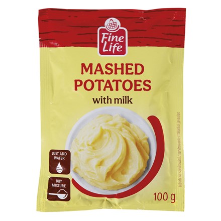 - 83% sušené bramborové vločky (brambory, emulgátor: mono- a diglyceridy mastných kyselin, kurkuma), sušené odstředěné mléko, jodizovaná sůl (jedlá sůl, jodičnan draselný), slunečnicový olej