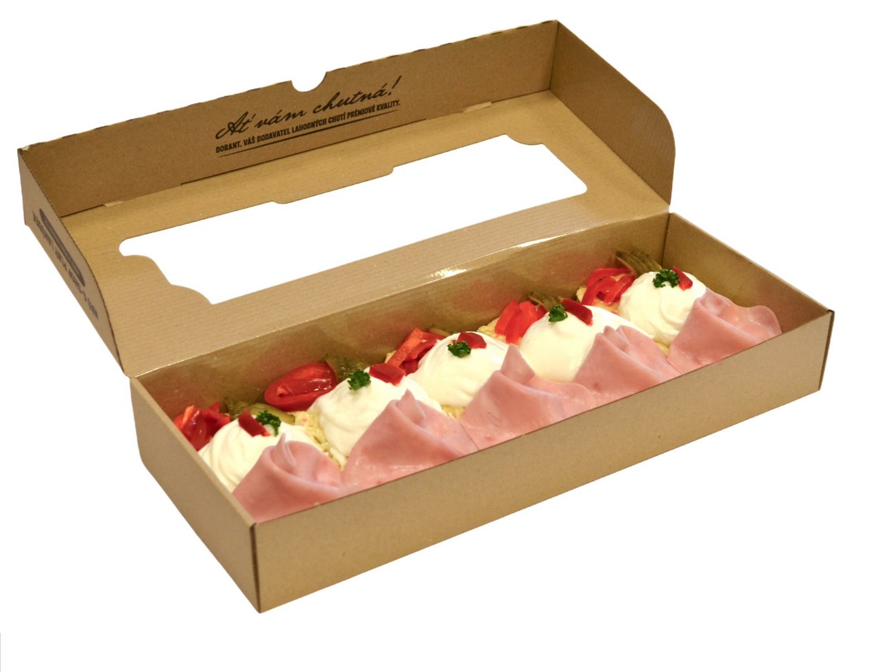 - veka, podkladový salát, vařená vejce, šunka, okurka, majonézový přeliv, kapie sterilovaná, petržel