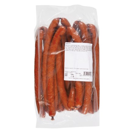 - Maso 88 % (vepřové + hovězí), voda, jedlá sůl, konzervant E250, bramborový škrob, směs koření, stabilizátory (E451, E450), cukry, antioxidant E301, paprikový extrakt E160c, aroma, česnek, kmín celý, kouřové aroma, hovězí kolagenní střevo.