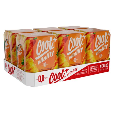 - Cool+ Vitality 0,0 Mango, Ananas a Pomeranč, míchaný nápoj z piva s cukrem a sladidlem z rostliny stévie 0,5l plech
