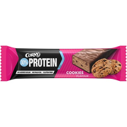 - CORNY 30 % Protein Cookies - Proteinová tyčinka s mléčnou čokoládou, s křupinkami, se sladidlem Lahodnou příchuť cookies si teď můžete vychutnat v Corny proteinové tyčince s vysokým obsahem bílkovin a bez přidaných cukrů. Dosáhli jsme měkčí a vláčnější textury díky kolagenu, což tě zaručeně potěší. Tyčinka, která jednoznačně zaujme chutí a nutričním složením. - Skvělá chuť - 30% Proteinu - Bez přidaného cukru* - S pravou čokoládou - S vysokým obsahem vlákniny - Bez lepku a palmového oleje *Ob