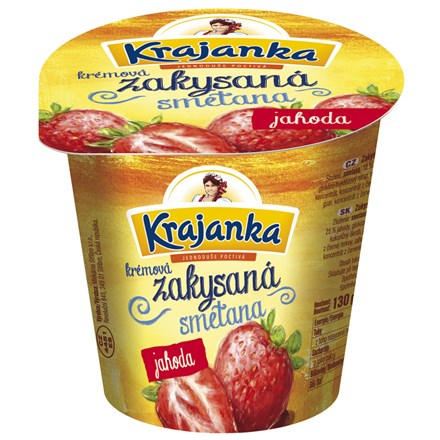 - SMETANA, 18% jahodová složka (cukr, 25% jahody, glukózo-fruktózový sirup, modifikovaný škrob, jahodový koncentrát, koncentrát z černé mrkve, zahušťovadla: pektin a guma guar, koncentrát z červené řepy, aroma), smetanová kultura.