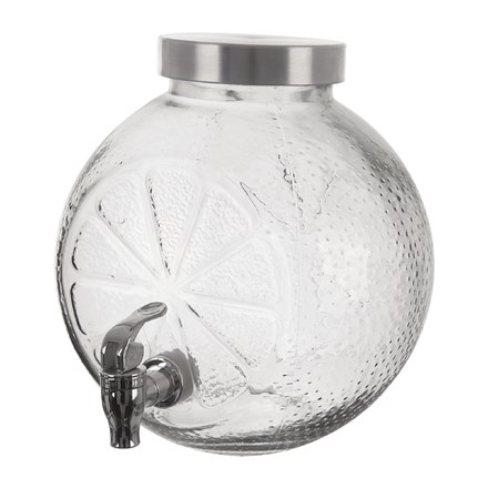 - Láhev s kohoutkem na vypouštění tekutiny je vhodná na různé party bowle, ovocné šťávy, limonády. Široký plnící otvor pro snadné vkládání a vybírání ovoce i pro mytí, kovové víčko na závit. Materiál: sklo, kov, plast, silikonové těsnění. Zásobník není vhodný pro horké tekutiny. Rozměry: objem 5,4 l, pr. 23 cm, v. 23 cm. Nepoužívejte na sycené nápoje. Náhradní kohoutek+těsnění z naší nabídky 181727. Skleněná část vhodná do myčky.