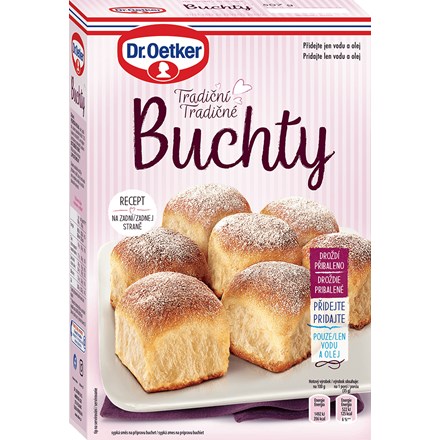 - Balení obsahuje: 500 g směsi na přípravu těsta 7 g sušeného pekařského droždí K tomu přidáte: 260 ml vlažné vody 120 ml oleje (12 polévkových lžic) náplň (povidlo, džem, tvaroh, mák) Všechny druhy trub před pečením dobře předehřejte! Elektrická trouba: 190 °C 35 - 40 min. Horkovzdušná trouba: 170 °C 35 - 40 min. Plynová trouba: střední stupeň 35 - 40 min. Při pečení respektujte zkušenosti s vlastní troubou! Příprava: 1. Obsah sáčku se směsí na přípravu těsta vysypeme do mísy a smícháme s přibaleným droždím. Přidáme odměřenou vodu a olej. Vařečkou vypracujeme hladké těsto, které se nelepí na stěny nádoby. Povrch těsta zaprášíme moukou, zakryjeme utěrkou a necháme na teplém místě 45-60 minut vykynout. 2. Vykynuté těsto rozválíme na pomoučeném vále na výšku asi 1 cm a rozkrájíme na čtverce. Do středu každého čtverce vložíme náplň (povidla, džem, tvaroh, mák) a okraje těsta spojíme stlačením. 3. Strany buchet potřeme olejem a vložíme je vedle sebe na vymazaný plech. Pečeme dozlatova. Čas a teplota pečení jsou uvedené v tabulce. Po upečení necháme buchty vychladnout a poté je od sebe oddělíme. Tip: Kynutá bábovka s náplní Těsto připravíme podle návodu a necháme vykynout. Vykynuté těsto vyválíme na moukou posypaném vále na výšku asi 1 cm. 250 g tvarohu rozmícháme se 2 vejci a 1 balíčkem Vanilínového cukru Dr. Oetker. 250 g povidel smícháme se 3 polévkovými lžícemi rumu. Tvaroh a povidla rozetřeme v podélných pruzích na těsto. Těsto srolujeme a roládu vložíme do vymazané a moukou vysypané bábovkové formy (o 23 cm). Pečeme v předehřáté troubě při teplotě podle tabulky asi 50 minut.