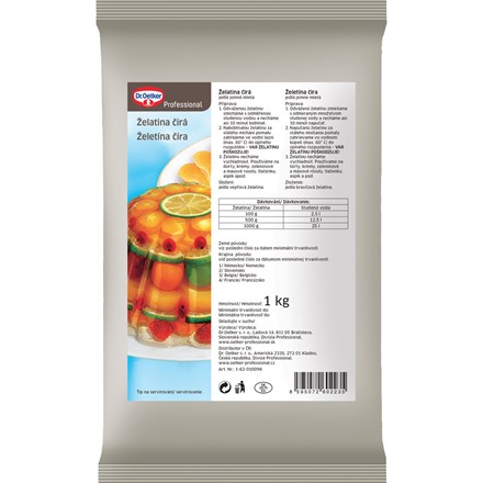 - Odváženou želatinu smícháme s množstvím odměřené studené vody a necháme asi 10 minut bobtnat. Nabobtnalou želatinu za stálého míchání pomalu zahřejeme ve vodní lázni (max. 60°C) do úplného rozpuštění. VAR ŽELATINU POŠKOZUJE! Želatinu necháme vychladnout. Dávkování: 100g želatiny + 2,5 l vody