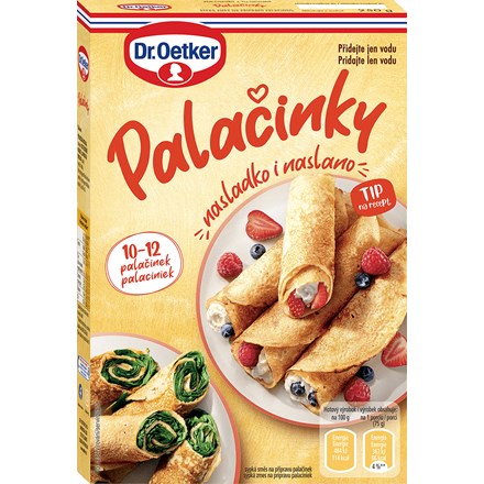 - příprava: 250 g směsi na přípravu palačinek, 400 ml studené vody 1. Obsah sáčku vysypeme do misky a přidáme 500 ml studené vody. Směs metličkou důkladně rozšleháme na hladkou hmotu bez hrudek. Těsto necháme asi 5 minut odstát. 2. Na rozehřátou pánev potřenou olejem nalijeme tenkou vrstvu těsta a rozlijeme ji po celé ploše pánve. Palačinky smažíme dozlatova z obou stran. Na jednu palačinku potřebujeme asi 1 lžíci oleje. 3. Hotové palačinky plníme džemem, tvarohovou nebo ořechovou náplní a podle chuti dozdobíme čokoládou a šlehačkou.