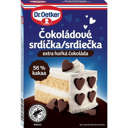 - Čokoládová srdíčka: extra hořká čokoláda 56 % kakaa, dekorační cukrovinka