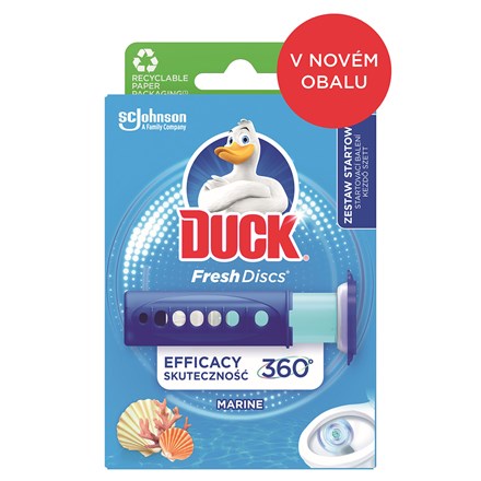 - DUCK čistič WC Fresh Discs Marine udrží vaši toaletu čistou a svěží. Aktivně bojuje proti usazeninám vodního kamene, poskytuje dlouhodobou svěžest, jeho účinek, který funguje s každým spláchnutím, je skutečně dlouhotrvající a vydrží až po dobu 7,5 týdne. Má svěží vůní moře, která evokuje pocity svěžesti a jemnosti. WC čistič Fresh Discs od značky DUCK se aplikuje díky inovativnímu dávkovači do záchodové mísy skutečně hygienickým způsobem.