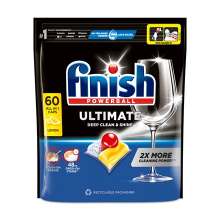 - Finish Ultimate All in 1 pro vynikající čistotu a lesk vždy a hned napoprvé. Odstraňuje všechny druhy nečistot pocházejících od jídla - dokonce i bez předmývání. Jeho pokročilé tříkomorové složení s technologií ACTIVELIFT je účinné v boji proti 48-hodin zaschlým skvrnám. Značka Finish je vázána slibem ochrany vodních zdrojů, a proto pracujeme na minimalizaci ekologické stopy, kterou zanechávají naše produkty a jejich balení. Obal kapslí je biologicky rozložitelný a 100% rozpustný ve vodě a chemi