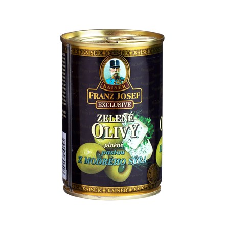 - Zelené olivy plněné pastou z modrého sýra ve slaném nálevu. Zpracované olivy. Pasterováno
