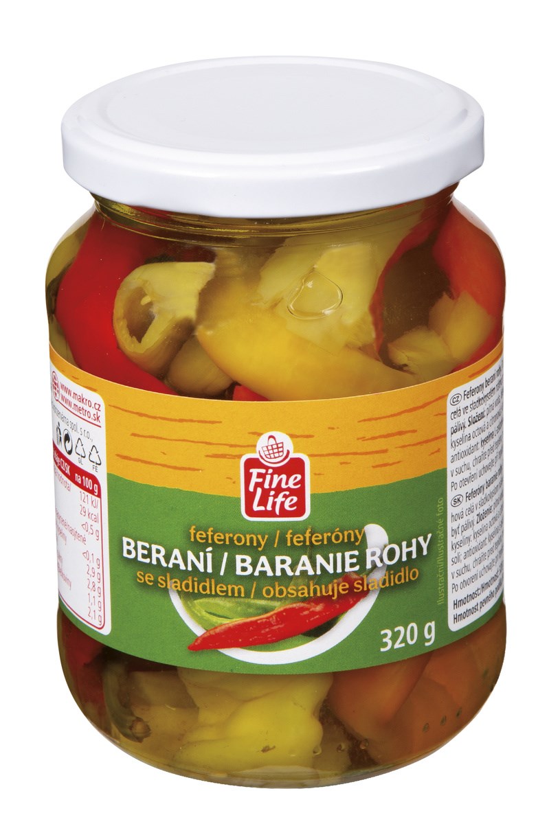 - Feferony, pitná voda, jedlá sůl, kyseliny: kyselina octová a citronová; sladidlo: sacharin a jeho sodné soli; antioxidant: kyselina L-askorbová; barvivo: riboflaviny.