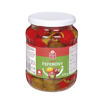 - feferony kulaté, pitná voda, ocet kvasný lihový, jedlá sůl s jódem (jedlá sůl, jodičnan draselný), cukr, sladidlo: sodná sůl sacharinu
