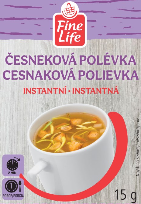 - krutony 37% (pšeničná mouka, slunečnicový olej, řepkový olej, jedlá sůl, kvasnice), maltodextrin, česnek 14,4%, jedlá sůl s jódem (jedlá sůl, jodičnan draselný), kvasničný extrakt (kvasnice, jedlá sůl), škrob, mrkev 2,4% majoránka, pór 1%, přírodní aroma, slunečnicový olej, petrželový list, extrakt z česneku 0,2%, celer, pepř černý, barvivo: amoniak-sulfitový karamel.