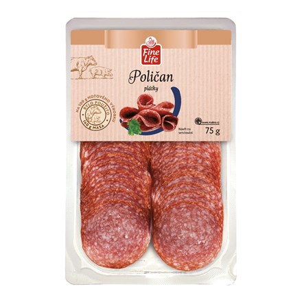 - FL POLIČAN PL.75g Masný výrobek trvanlivý fermentovaný. Baleno v ochranné atmosféře.