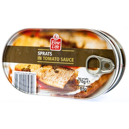 - Šproty v rajčatové omáčce. Sterilovaná rybí konzerva.