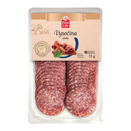 - FL VYSOČINA PL. 75g. Masný výrobek trvanlivý tepelně opracovaný. Baleno v ochranné atmosféře.