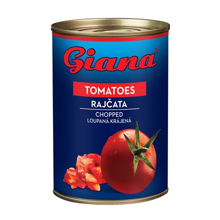 - Krájená loupaná rajčata 60%, rajčatová šťáva 39,8%, ,regulátor kyselosti: kyselina citronová, jedlá sůl.