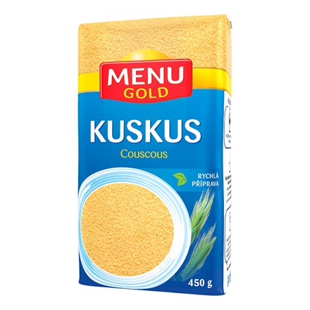 - Odměřené množství kuskusu nasypte do nádoby a zalijte dvojnásobným množstvím vroucí osolené vody. Přidejte trochu olivového oleje a promíchejte. Nechte 8–11 minut odstát. Promíchejte vidličkou.