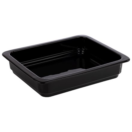 - GN 1/2 container 32,5 x 26,5 cm, h: 6 cm porcelain, black heat resistant up to 220°C 3,4 ltr
