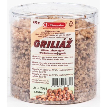 - cukr, jádra lískových OŘÍŠKŮ pražená, cukrový sirup, voda, barvivo: E150a, karamel, želatina, aroma