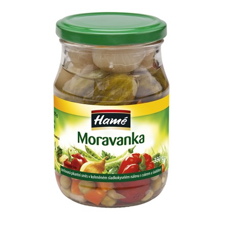 - Pikantní zeleninová směs Moravanka v kořeněném sladkokyselém nálevu s cukrem a sladidlem.Je ideální do bramborového salátu i jako příloha k hotovým jídlům.