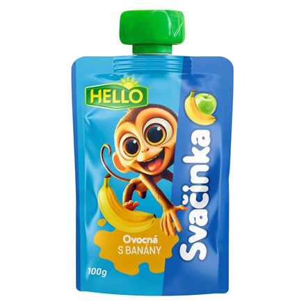 - Ovoce 85% hm. (jablečná dřeň 62% hm., banánová dřeň 23 % hm.), voda, cukr, modifikovaný škrob, antioxidant: kyselina askorbová, vitamín C (min. 10 mg ve 100 g, tj. 40% referenční hodnoty pro kojence a malé děti a 12,5% referenční hodnoty příjmu pro dospělé)