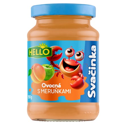 - Ovoce 85% hm. (jablečná dřeň 63% hm., meruňková dřeň 22 % hm.), voda, cukr, modifikovaný škrob, antioxidant: kyselina askorbová, vitamín C (min. 10 mg ve 100 g, tj. 40% referenční hodnoty pro kojence a malé děti a 12,5% referenční hodnoty příjmu pro dospělé)