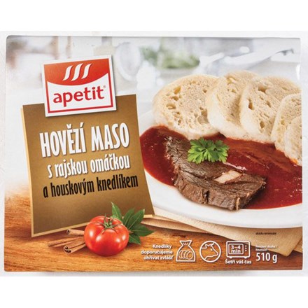 - Hovězí maso s rajskou omáčkou a houskovým knedlíkem