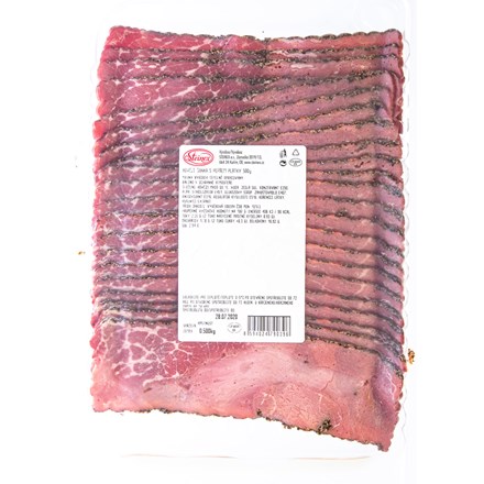 - Složení: Hovězí maso 80 %, voda, jedlá sůl, konzervant E250, pepř 1%, stabilizátor E451, glukózový sirup, zahušťovadlo E407a, antioxidant E316, regulátor kyselosti E516, kořenící látky, extrakty koření, karamel E150a. Třída jakosti: výběrová (obsah ČSB min. 13 %).
