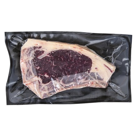 - *Hovězí roštěná steak s kostí Dry Aged, hovězí výsekové maso, zrající za sucha 28 dní, vakuově baleno