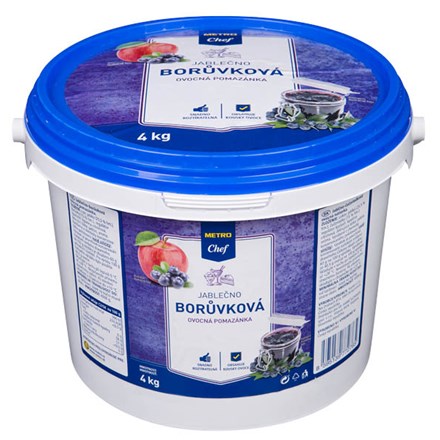 - cukr, jablka (25,5 % hm.), borůvky (15 % hm.), regulátor kyselosti: kyselina citrónová, želírující látka: pektin, aroma. Vyrobeno z chemicky konzervovaného polotovaru (OXID SIŘIČITÝ). Výrobek je povrchově konzervován roztokem sorbanu draselného. Ve 100 g výrobku je obsaženo 60 g přírodních sladidel. Pro výrobu 100 g hotového výrobku bylo použito 40,5 g ovoce.