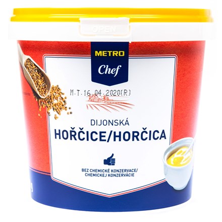 - Pitná voda, HOŘČIČNÉ SEMENO, ocet kvasný lihový, jedlá sůl (masx. 6,5%), kurkuma, stabilizátor:xanthan.
